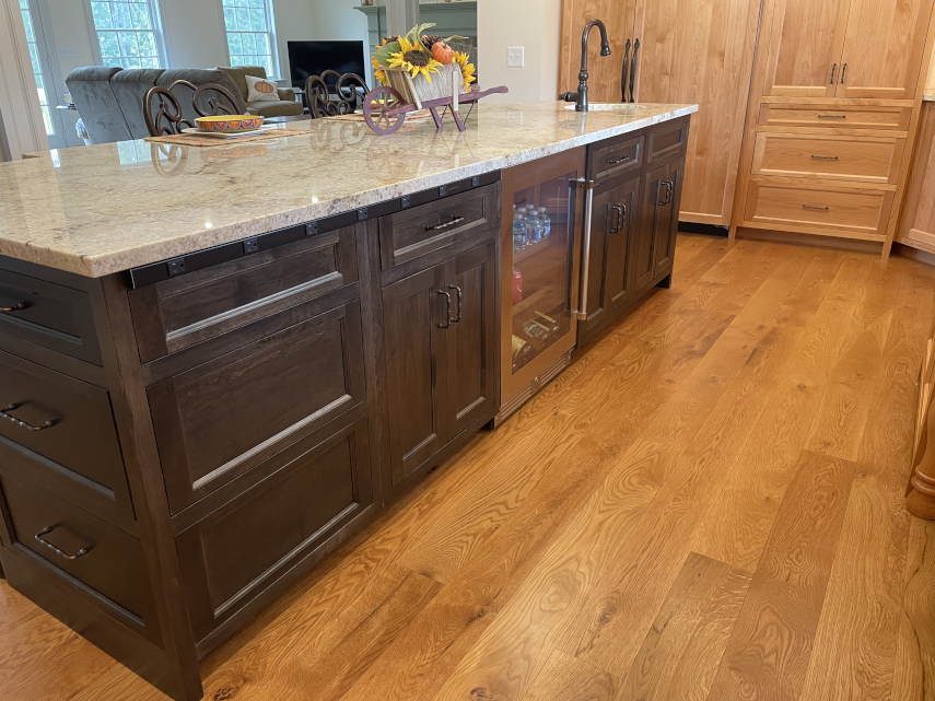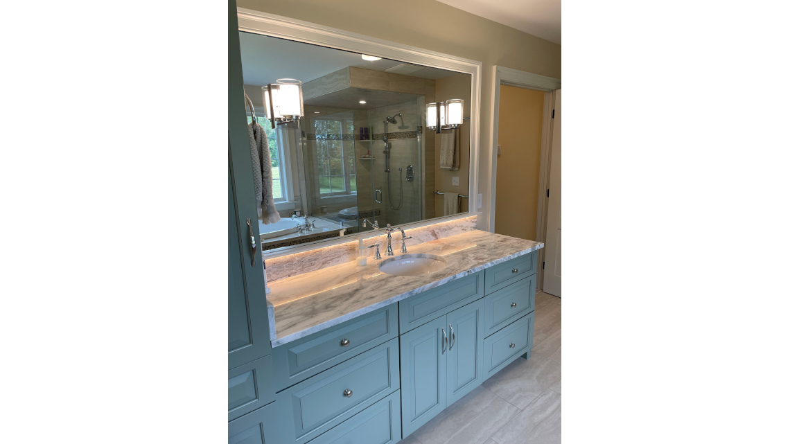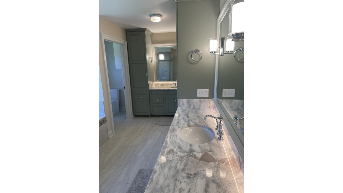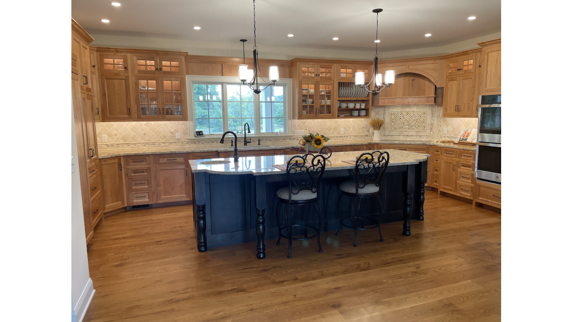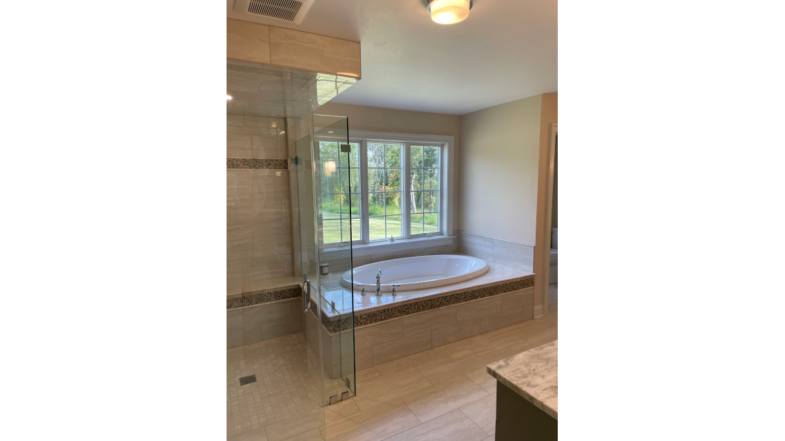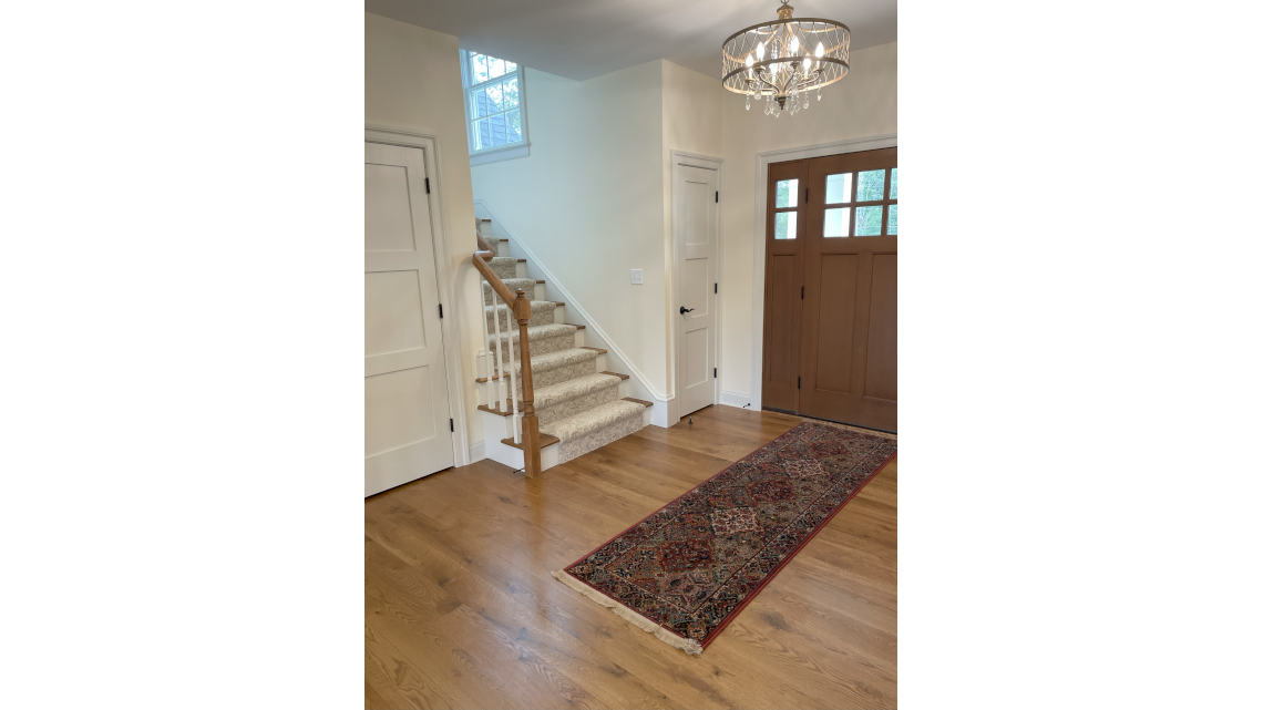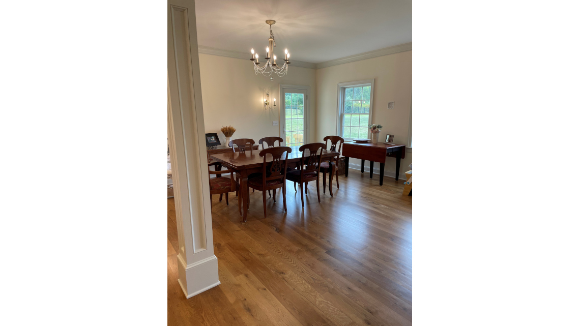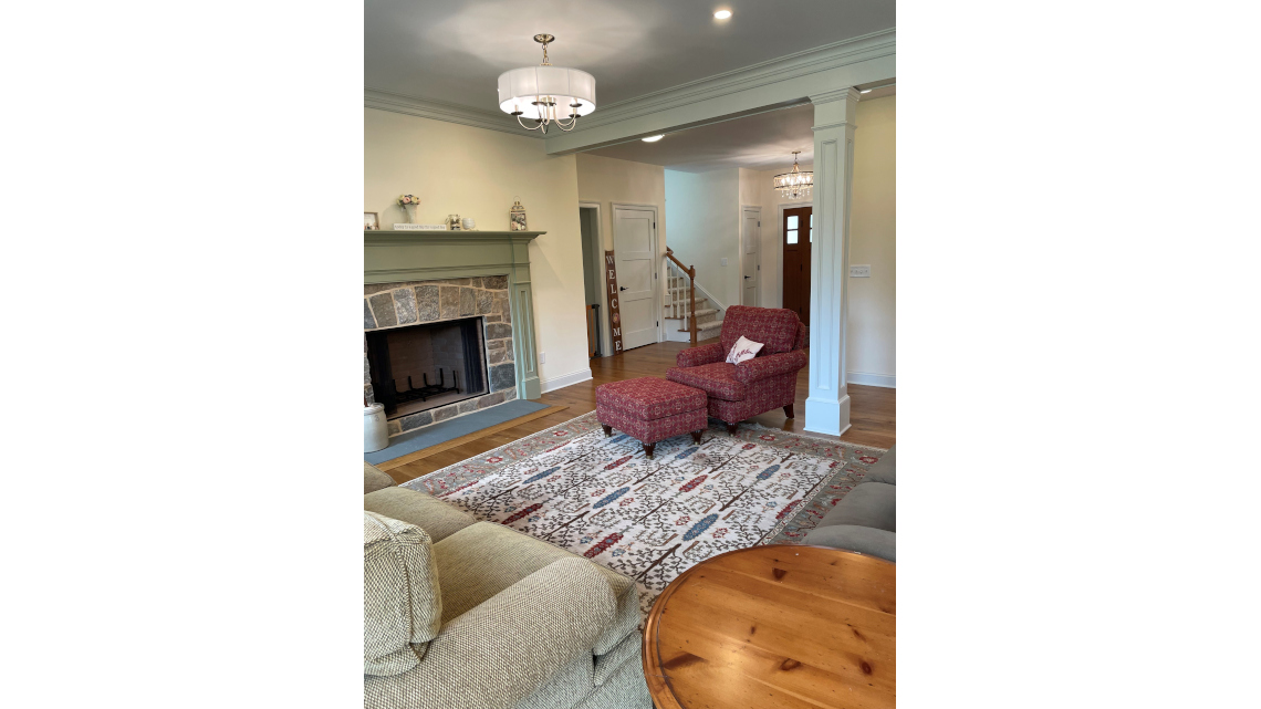 Our clients wanted a spacious, open floor plan to accommodate their growing family. The kitchen features generous workspace for baking and cooking, along with ample appliance storage. A built-in homework area allows children to stay close by as parents prepare meals, making supervision easy and convenient. The dining and living spaces are seamlessly connected for effortless entertaining and everyday living. Both a home office and the primary suite are located on the first floor for accessibility and privacy. The primary bathroom is designed with luxury in mind, including a large walk-in shower, separate soaking tub, a private water closet, and dual vanities—ensuring both parents can get ready comfortably at the same time.